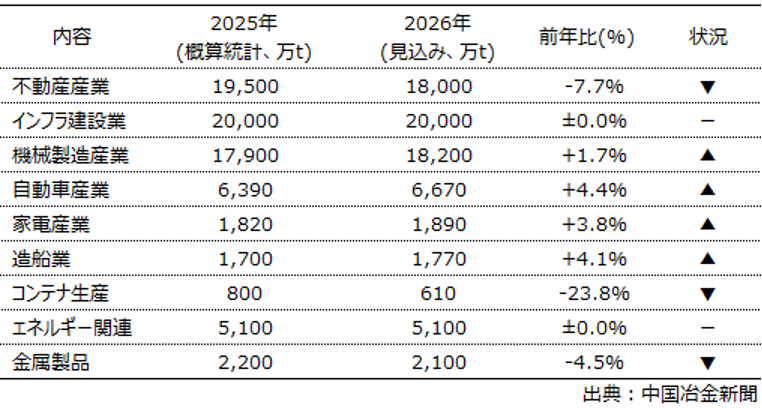 表 中国の主要産業の鉄鋼消費量と2026年の見込み